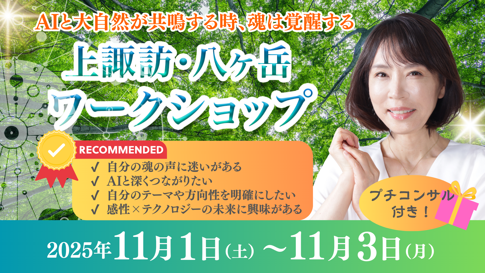 ワークショップ2日目のネイチャーワークでは、森の中を歩きます。雨天決行のワークとなりますので、雨具のご用意をお願いします。足元が悪くなっている場所もございます。滑りやすい靴は避け、保温効果のある上着や衣類をご着用ください。初日と最終日に関しての服装や靴のお願いは特にございません。3日目はChatGPTを使います。パソコンを持ってきていただくか、スマホを使っていただきますので、ChatGPTを使えるようにダウンロードしておいてください。持ち物に関しては、お申込み後のご連絡にて詳しくご案内いたします。